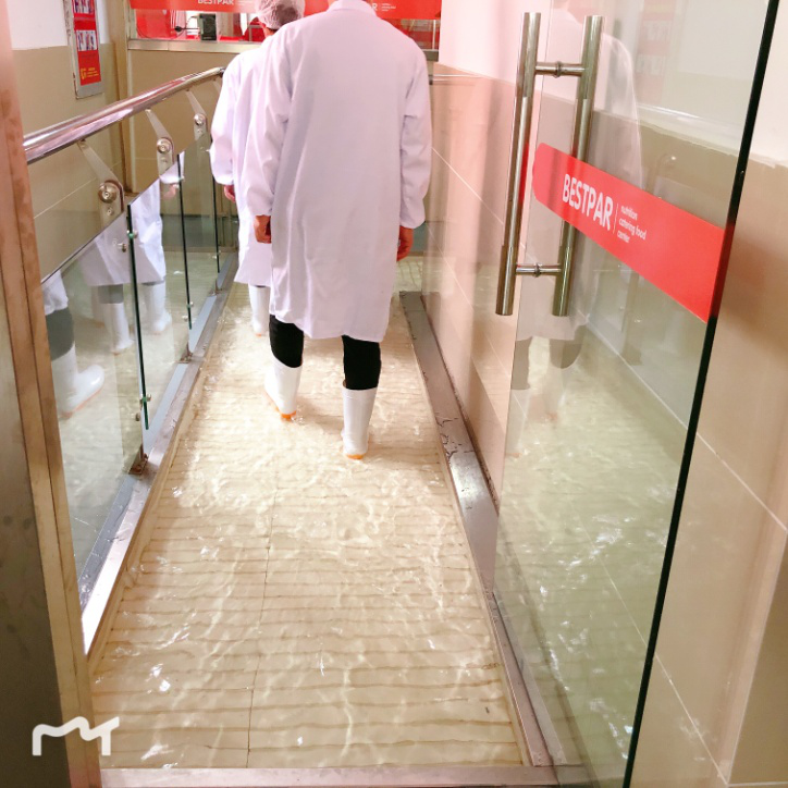 進(jìn)入制餐中心,體溫檢測合格后,會(huì)進(jìn)入消毒池,對(duì)鞋底進(jìn)行消毒清洗,保證制餐中心的衛(wèi)生與整潔。